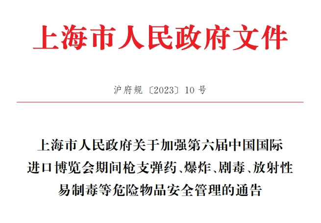 2023年11月5日至11月10日,上海舉辦第六屆中國國際進口博覽會,期間將對易制毒化學品及運輸危險品車輛實施嚴格管控。一、2023年10月25日0時至11月12日24時,停止民用槍支彈藥配售、配購(含行政審批)。11月4日0時至11月12日24時,停止射擊競技體育運動單位、營業...