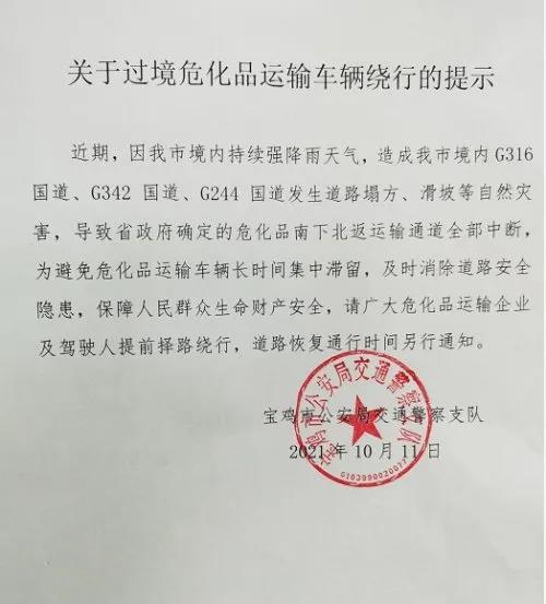 近期,因寶雞市境內持續強降雨天氣,造成寶雞市境內G316國道、G342國道、G244國道發生道路塌方、滑坡等自然災害,導致省政府確定的危化品南下北返運輸通道全部中斷,為避免危化品運輸車輛長時間集中滯留,及時消除道路安全隱患,保障人民群眾生命財產安全。 請廣大危化品運輸企業及駕駛人提前擇路繞行,道路恢復通行時間另行通知。 陜西其他限行措施: G85銀昆高速寶雞南互通立交至田壩樞紐立交段限行 為進一步加強危化品道路運輸安全管理,防范化解交通安全風險隱患,保障人民群眾生命、財產安全,全力預防危化品運輸車輛道路交通事故,依據《中華人民道路交通安全法》《危險貨物道路運輸安全管理辦法》等有關法律、行政法規。結合道路實際,經研究決定,禁止危化品運輸車輛通行G85銀昆高速寶雞南互通立交(K601+000)至田壩樞紐立交(K649+100)段道路(隧道群)。現將有關事項通告如下: 一、限行車輛 危化品運輸車輛。 二、限行路段 G85銀昆高速寶雞南互通立交(K601+000)至田壩樞紐立交(K649+100)段道路。 三、限行時間 10月8日起全天24小時禁止危化品運輸車輛通行。 四、繞行路線 (一)連霍高速甘肅天水和楊凌方向及G85銀昆高速平涼方向來車,經潘家灣樞紐立交駛入G85銀昆高速至寶雞南出口駛出,經高速公路引線駛入S219省道。 (二)漢中方向來車,經G244國道潘太公路通行、禁止駛入G85銀昆高速。 (三)過境危化品運輸車輛嚴禁駛入寶雞市區道路。 陜西殘特奧會期間限行 殘特奧會賽事期間對陜西省境內危化品運輸車輛實施交通管制,具體通告如下: 劇毒化學品車輛 2021年10月18日00:00——30日24:00 全省境內禁止劇毒化學品運輸車輛通行。 危化品運輸車輛 2021年10月20日00:00——24日24:00 2021年10月27日00:00——30日24:00 全省境內禁止危化品運輸車輛通行。