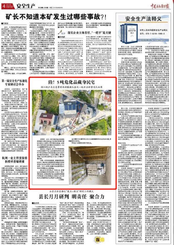 10月14日,《中國應急管理報》第4版刊發報道《險!5噸危化品藏身民宅 浙江桐廬縣應急管理局順藤摸瓜查處一起非法經營危化品案》一文。全文如下: 2021年10月14日,浙江桐廬縣應急管理局根據日常執法檢查中發現的線索對轄區內某化工有限公司開展突擊檢查,發現該公司所在民宅的輔房內存放槍水、55%工業氫氟酸等危化品共5噸。 經執法人員查實,該公司未取得危險化學品經營許可證,且該儲存場所安全條件不符合《危險化學品經營企業安全技術基本要求》的規定,一旦發生事故,將可能導致廠區及周邊居民區200余人中毒的嚴重后果。 為第一時間消除隱患,保障周圍居民的安全,桐廬縣應急管理局當晚就對該批危險化學品依法進行扣押并轉移至安全場所。次日,該局以涉嫌非法經營危險化學品對涉事企業立案調查。 通過多次走訪取證、專家論證,涉事企業因涉嫌違反《刑法》第134條之一第三項的規定,該案被桐廬縣應急管理局根據行刑銜接工作機制移送公安機關,后公安機關以涉嫌危險作業罪進行立案偵查。