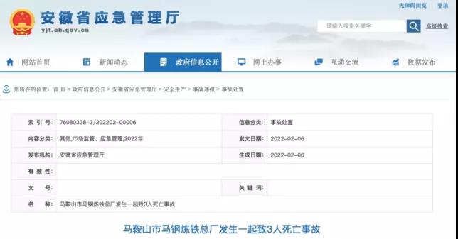 熱鬧的春節假期結束了,令人沒想到的是假期最后一天,安徽一煉鐵廠突發事故,致4人不幸遇難。 復工安全千萬不能兒戲! 據安徽省應急管理廳通報,2月6日上午,安徽馬鞍山市馬鋼煉鐵總廠一料倉發生事故,致4人不幸遇難、1人受傷。 2月6日上午10時20分左右,馬鋼煉鐵總廠區域內一料倉本體漏灰,6名工作人員進行搶修作業時,灰斗本體突然開裂,大量脫硫灰冒出。工作人員被從四樓平臺沖至二樓平臺,4人送醫搶救,其中3人搶救無效死亡,1人生命體征平穩;另1人手部輕微灼傷;1人被掩埋,17時被搜救出已無生命體征。 目前,事故原因正在調查分析中。
