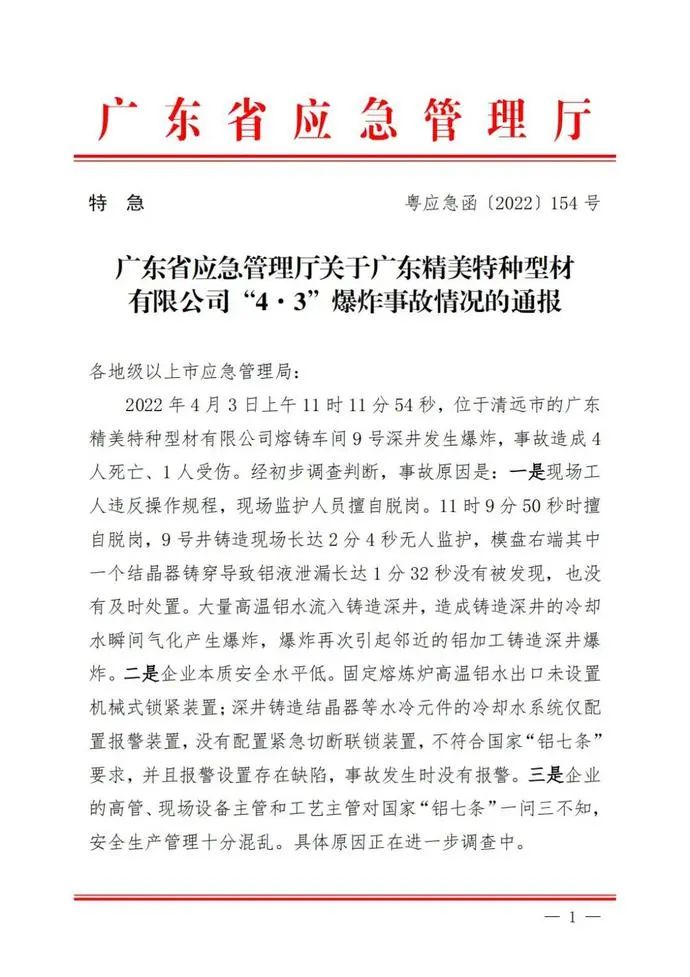 4月3日上午,廣東清遠某特種型材有限公司熔鑄二號車間9號鑄造井發生爆炸事故。事故造成4人死亡、1人重傷,廠房嚴重損毀。 監控視頻顯示,爆炸現場升起數米高的“蘑菇云”。 4月5日,清遠市清城區應急管理局通報,經現場初步判斷,直接原因為:鋁棒在拉鑄過程中,鋁水泄漏到冷卻水池內導致事故發生。 事故通報顯示,具體事故原因初步總結為: 一是現場工人違反操作規程,現場監護人員擅自脫崗。 二是企業本質安全水平低。 三是企業的高管、現場設備主管和工藝主管對國家“鋁七條”一問三不知,安全生產管理十分混亂。 有關善后工作正在進行中,清遠已成立事故調查組,正開展事故調查處理工作。