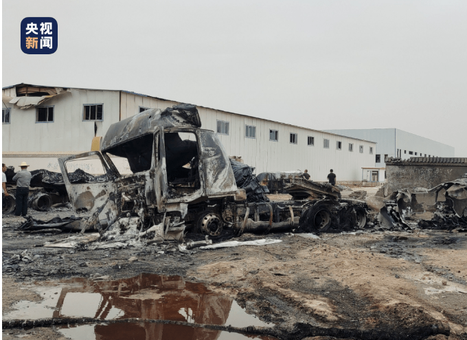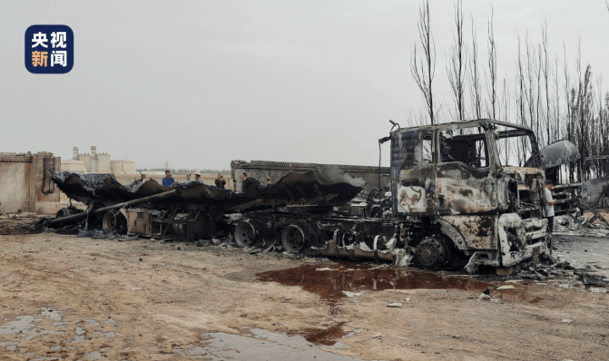 總臺記者已到達事故現場,事故發生于青海省格爾木市G109國道與東海路交叉口向北約200米處。現場火勢已經撲滅,空氣中彌漫著刺鼻的味道,可以看到三輛殘缺不全的罐車殘骸,一旁瑞城工業園的側門也在爆炸中被炸毀。