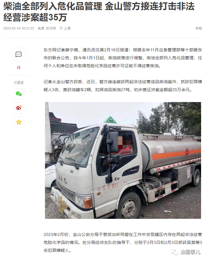 案例一:近日,長沙市天心區應急管理局接到群眾舉報,在暮云街道蓮河村蓮河加油站正后面100米處一板房內,儲存了危險化學品。該局立即聯合組織公安、街道等部門上門核實,發現龔某某為節約成本,在自建板房油罐內儲存2.88噸柴油,供自家車隊使用。臨邊就是中石化蓮河加油站,一旦出現泄漏事故,易造成人員傷害和環境傷害,存在重大的安全隱患。天心區應急管理局當即對危險化學品進行了扣押,消除安全隱患。 目前,天心區應急管理局已經對龔某某立案調查,龔某某未將危險化學品儲存在專用倉庫內,違反了《危險化學品安全管理條例》相關規定,執法人員依據《危險化學品安全管理條例》和《安全生產行政執法與刑事司法銜接工作辦法》(應急〔2019〕54 號)相關規定,對龔某某作出罰款60000元的行政處罰,并移交公安部門進行行刑銜接。 案例二:3月3日下午,根據群眾舉報,長沙市開福區應急管理局聯合青竹湖街道對湖南某公司開展危險化學品“打非治違”執法檢查行動。該公司位于新港路80號,現場設置了地下儲油罐1個、加油機1臺。公司負責人表示,儲罐內儲存的0號車用柴油主要用于公司內部車輛加油使用。執法人員檢查發現地下儲罐全部浸泡水中,銹蝕嚴重,且未采取任何安全防范措施,存在巨大安全隱患。 該公司涉嫌違反《危險化學品安全管理條例》第二十四條第一款“危險化學品應當儲存在專用倉庫、專用場地或者專用儲存室(以下統 稱專用倉庫)內,并由專人負責管理的規定”。執法人員依法對該地下儲油罐進行查封,扣押柴油4.6噸。目前案件正在進一步調查中。2023年1月1日起,所有柴油列為《危險化學品目錄》,不再區分閃點。為打好安全生產攻堅仗,開福區危化煙花工貿專委會深入推進柴油專項整治工作,組織各街道、各部門全面摸排,特別是物流運輸企業、渣土公司、攪拌站、建設工地、廢鐵站等用油量較大的單位,嚴禁違規設置露天罐、埋地罐等非法儲油設施;交警、交通部門將加大對非法改裝廂式貨車、面包車非法運輸柴油的打擊力度;公安機關積極配合辦理行刑銜接案件。 案例三:2023年2月初,上海金山公安分局干巷派出所民警在工作中發現轄區內存在兩起非法經營危險化學品的情況。在分局經偵支隊的指導下,分別于2月3日和2月5日抓獲吳某等3名犯罪嫌疑人。經查,犯罪嫌疑人吳某等3人在已申報但還未取得危險化學品經營許可證的情況下,長期從事柴油銷售,他們從正規渠道以“批發價”購入柴油,銷售的柴油主要用于工地施工設備以及農場農用機械等,至案發已非法銷售柴油50余噸,涉案金額超35萬元。 目前,犯罪嫌疑人吳某、尹某、艾某3人因涉嫌非法經營罪被公安機關依法采取刑事強制措施,案件正在進一步審理中。根據網絡上的政策解讀,柴油全部列入危化品管理后,將嚴厲打擊一些個人或企業利用內部自用加油站的名義(比如物流公司內部車輛加油)來打擦邊球進行柴油對外經營或貿易的行為,柴油納入危化品管理后,若無證經營或儲存,將面臨刑法的危險作業罪、非法經營罪的責任追究。此外,按照治安管理處罰法相關要求,對加油站對外銷售打桶或散裝柴油有可能更加嚴格,對于偷盜柴油的行為,處罰會更加嚴重。 危化品介紹 2022年11月7日,應急管理部等10部門發布關于調整《危險化學品目錄(2015版)》的公告,將“1674柴油[閉杯閃點≤60℃]”調整為“1674柴油”,新規于2023年1月1日起施行。危險化學品,是指具有毒害、腐蝕、爆炸、燃燒、助燃等性質,對人體、設施、環境具有危害的劇毒化學品和其他化學品。一旦儲存運輸不當,將會嚴重危害影響人民的生命安全和環境安全。危險化學品對于儲存場地有特殊的要求,應與其他貨物分開儲存,儲存在專用倉庫內,并有專人負責管理。 溫馨提醒 企業在儲存和使用危險化學品時,要對危險化學品進行管理,采取安全措施。危險化學品必須存放到專用倉庫,倉庫應建在企業單位區域邊緣且保證有安全的防火間距。倉庫必須具有良好的通風、隔熱條件,配備降溫、防潮、防汛、防雷等設施。倉庫的設施需要定期由專人檢查登記。倉庫內應安裝自動監測和火災報警系統。倉庫內設施皆需要防爆功能,比如防爆燈、防爆風扇、防爆開關等。庫房門應采用外開式防火門,且有良好接地。倉庫地面需采用不燃燒且易洗的地坪。倉庫內地坪需比外面地坪高至少0.2m,倉庫門口應有斜坡。儲存易燃易爆危險化學品的場所應符合防火防爆安全規定,區域內嚴禁煙火和明火。 危險化學品入庫時應嚴格檢驗物品質量、數量、包裝等情況。庫房的溫度、濕度應嚴格控制,經常檢查,發現變化及時調整。容易發生化學反應或滅火方式不同的各類危險化學品不得混儲混存。對遺留在地上和墊倉板上的危險化學品,必須及時清除,保持庫房清潔。 倉庫內需要貼有各類標識,注明化學品名稱規格和提醒危險類型。倉庫儲量不可超量,物品堆垛不可過高過大過密,必須留有消防通道。 知識科普--如何存放危險化學品? (一)設置危化品專用倉庫,專用倉庫不僅要“硬件”過關,依法取得許可證,符合國家標準對安全、消防的要求,設置明顯標志;還要“管理”過關,設專人管理,定期監測儲存設備和安全設施,配備可靠的個人安全防護用品,并經考核合格,方可上崗。 (二)危險化學品儲存應當注意以下7種情況: 1、商品避免陽光直射,