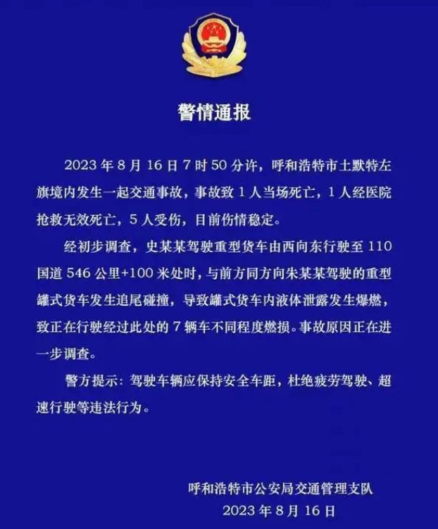 8月16日,呼和浩特市土默特左旗一輛重型危化品罐車與多車相撞,發生爆燃,事故造成2人死亡,5人受傷。 視頻顯示,至少有三輛大車并排停在公路上,車身起火冒起濃煙,路牌顯示事故地點距離賈力更故居15公里。拍攝者身處一片草叢中,遠處火焰熊熊燃燒,黑煙漫天,同時傳出爆炸聲響。 據@平安青城通報:8月16日7時50 分許,呼和浩特市土默特左旗境內發生一起交通事故,事故致1人當場死亡,1人經醫院搶救無效死亡,5人受傷,目前傷情穩定。 經初步調查,史某某駕駛重型貨車由西向東行駛至110國道 546 公里+100 米處時,與前方同方向朱某某駕駛的重型罐式貨車發生追尾碰撞,導致罐式貨車內液體泄漏發生爆燃致正在行駛經過此處的7輛車不同程度燃損。事故原因正在進一步調查。