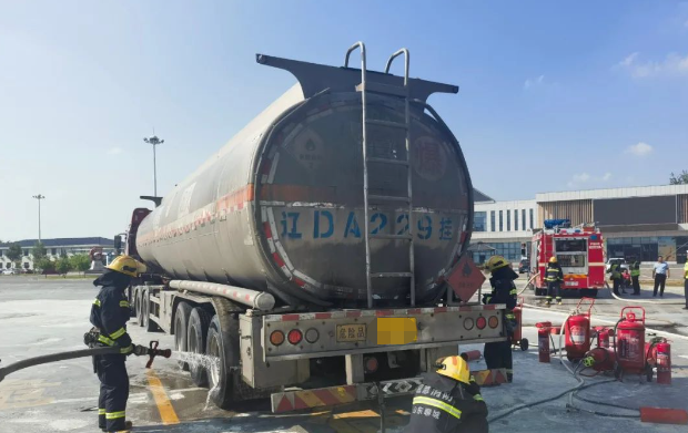 8月30日14時50分左右,一輛滿載42噸柴油罐車途經濟聊高速聊城服務區北區廣場停車休息時,油罐車后部輪胎突然爆炸,瞬時燃起熊熊大火,濃煙向周圍彌漫,情況萬分危急。 更讓人驚心的是著火油罐車西側100米緊鄰加油站,起火部位位于罐體下方,油罐車一旦爆炸將會造成重大傷亡與損失,后果不堪設想。 服務區工作人員發現險情后,立即撥打119火警電話,同時,組織現場警戒,疏散周圍車輛,封閉服務區北區及附近加油站,控制火勢。15時許,消防車抵達現場增援,消防員緊急出動協助滅火。 最后,消防員對著火部位和罐體繼續冷卻,交警、路政及時通知司機聯系運輸車輛前來轉輸。
