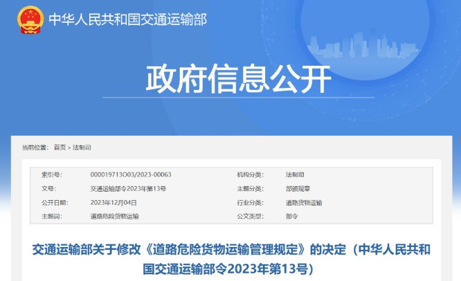 近日,國務院發布《關于修改和廢止部分行政法規的決定》(國務院令第764號,以下簡稱《決定》),對《中華人民共和國道路運輸條例》作出修改。 為落實《決定》要求,交通運輸部對《道路危險貨物運輸管理規定》進行了相應修改,取消了“對道路危險貨物運輸企業或者單位不按照規定隨車攜帶道路運輸證行為的罰款”。 此外,依據國家機構改革部署,對部分機構名稱進行了相應修改;依據近兩年新頒布實施的《中華人民共和國安全生產法》,對處罰規定進行了梳理和調整,以與上位法保持一致;根據近兩年標準修改、廢止情況,對引用的標準名稱進行了相應更新。 詳情如下: 一、將第三條中的“《危險貨物品名表》(GB 12268)”、第四條中的“《危險貨物分類和品名編號》(GB 6944)”“《危險貨物品名表》(GB 12268)”“《危險貨物運輸包裝通用技術條件》(GB 12463)”修改為“《危險貨物道路運輸規則》(JT/T 617)”。 二、將第七條第二款修改為:“縣級以上地方人民政府交通運輸主管部門(以下簡稱交通運輸主管部門)負責本行政區域的道路危險貨物運輸管理工作”;刪去第三款。 三、將第九條、第十一條中的“安全生產監督管理部門”修改為“應急管理部門”。 四、將第十條中的“工商行政管理機關”修改為“市場監督管理部門”。 五、刪去第八條第一項第6目中的“質量檢驗部門”、第二十三條、第二十四條第三款中的“質量檢驗部門出具的”。 六、將第三十六條、第四十四條中的“《汽車運輸危險貨物規則》(JT 617)”“《汽車運輸、裝卸危險貨物作業規程》(JT 618)”修改為“《危險貨物道路運輸規則》(JT/T 617)”。 七、第四十八條改為第四十七條,將其中的“安全生產監督管理部門和環境保護、衛生主管部門”修改為“應急管理部門和生態環境、衛生健康主管部門”。 八、第五十六條改為第五十五條,將其中的“有違法所得的”修改為“違法所得超過2萬元的”。 九、刪去第五十九條。 十、第六十一條改為第五十九條,修改為:“違反本規定,道路危險貨物運輸企業或者單位未配備專職安全管理人員的,由交通運輸主管部門依照《中華人民共和國安全生產法》的規定進行處罰。” 十一、將“道路運輸管理機構”“道路危險貨物運輸管理機構”“縣級以上道路運輸管理機構”統一修改為“交通運輸主管部門”。 條文序號和個別文字作相應修改。 本決定自公布之日起施行。 《道路危險貨物運輸管理規定》根據本決定作相應修正,重新公布。