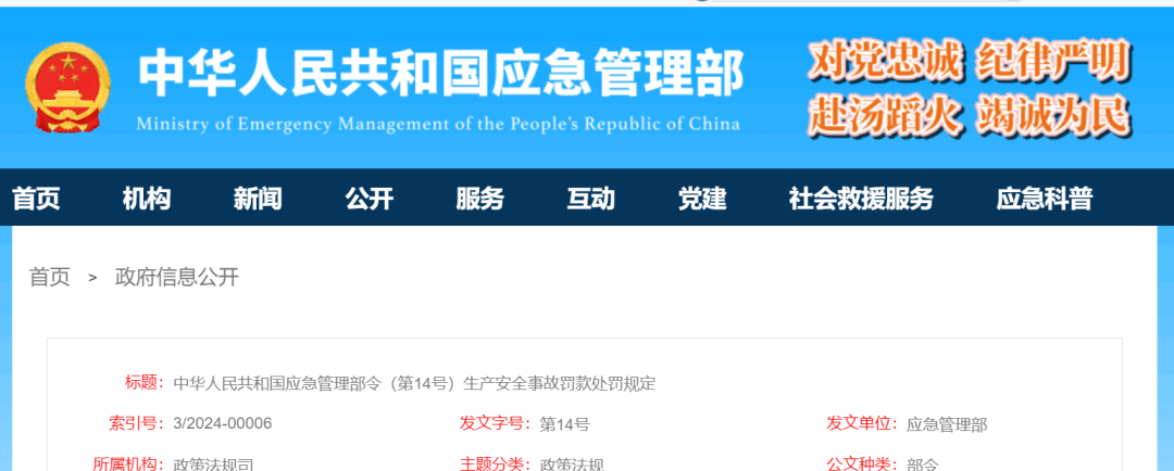 《生產安全事故罰款處罰規定》已經2023年12月25日應急管理部第32次部務會議審議通過,現予公布,自2024年3月1日起施行。