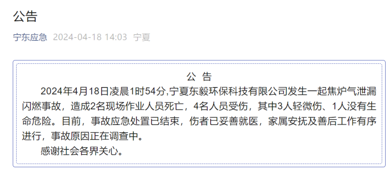 2024年4月18日凌晨1時54分,寧夏東毅環保科技有限公司發生一起焦爐氣泄漏閃燃事故,造成2名現場作業人員死亡,4名人員受傷,其中3人輕微傷、1人沒有生命危險。目前,事故應急處置已結束,傷者已妥善就醫,家屬安撫及善后工作有序進行,事故原因正在調查中。 據了解,寧夏東毅環保科技有限公司是寶豐能源集團旗下的企業。該公司成立于2010年11月01日,位于寧夏寧東能源化工基地寶豐能源循環經濟項目區。 2024年1月31日,寧夏寶豐能源集團股份有限公司精細化工廠曾發生一起爆燃事故,造成現場臨近的2名巡檢人員受輕傷。事故發生后,寶豐公司立即啟動應急響應,14分鐘火情解除,事故得到有效處置,未發生次生災害。