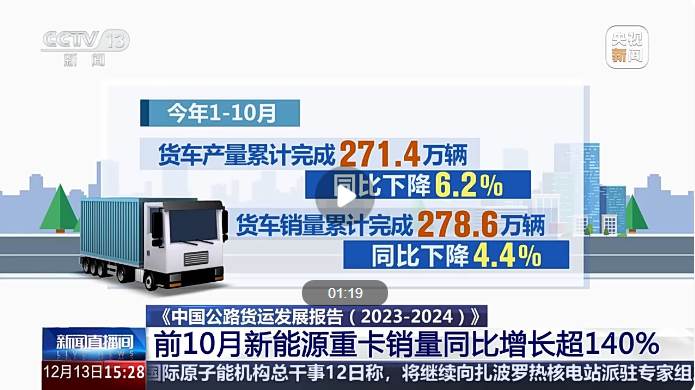 中國物流與采購聯合會今天(13日)公布《中國公路貨運發展報告(2023—2024)》。根據報告,受運輸結構調整影響,我國公路運輸占比雖有所下降,但依然是貨運市場的主體,公路貨運保持平穩增長。 根據報告,今年前三季度,我國貨物運輸總量為416.3億噸,同比增長2.3%。從貨運結構來看,鐵路與水路運輸承擔的貨運量占比有所提升,公路運輸占比有所下降。前三季度公路貨運運輸量為306.6億噸,同比增長3.1%,占比超過73%,公路運輸仍然是貨運市場的主體。 中國物流與采購聯合會副會長 賀登才:公路運輸是我們整個物流體系中非常重要的一個環節,它的優勢是能夠點到點、門到門,靈活性強。調整運輸結構,有些環節離不開公路貨運。除了硬件方面使用新能源車、自動駕駛提高它的運輸效率外,現在通過平臺進行一些數字化改造,通過網絡貨運平臺及時溝通供需信息。 另外,報告指出,跨境公路運輸成為新增長點。2023年,我國跨境公路貨運市場規模約為4500億元,同比增長12%。隨著“一帶一路”建設深入推進,便利化協定實施范圍穩步擴大,我國與蒙古國、俄羅斯及中亞各國的國際道路運輸進一步暢通,貨運量增長明顯,逐漸形成以邊境口岸為節點、覆蓋周邊國家邊境地區重要城市并向腹地不斷延伸的國際道路運輸網絡。 前10月新能源重卡銷量 同比增長超140% 根據《中國公路貨運發展報告(2023—2024)》,今年1—10月,我國貨車產銷量累計均超過270萬輛,其中新能源重卡銷量增長明顯,同比增長超過140%。 根據報告,2023年我國貨車保有量3359萬輛,同比增長1.2%。今年1—10月,貨車產銷量累計分別完成271.4萬輛和278.6萬輛,同比分別下降6.2%和4.4%。 與傳統重卡相比,新能源重卡展現出強大的市場活力。今年1—10月,新能源重卡累計銷量56760輛,同比增長超過140%,預計全年新能源重卡滲透率將突破8%。 中國物流與采購聯合會公路貨運分會秘書長 周志成:新能源重卡逆勢上漲,既有政策導向,也有成本的優勢。第一,新能源相比傳統能源,價格優勢比較明顯;第二,新能源電池價格下降,也降低了企業的購車成本。還有很多城市在推進新能源進城通行證的減免政策,也促進了企業新能源車的使用。
