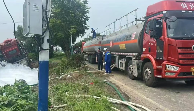 6月27日凌晨1時(shi)(shi)許,一輛(liang)滿載33噸汽(qi)油的山(shan)東(dong)籍危險品罐車(che)(che)行(xing)駛至蚌埠市淮上(shang)區(qu)沫河口(kou)洪(hong)廟村路(lu)段(duan)時(shi)(shi),因夜間降雨路(lu)滑(hua)發生側翻,導致(zhi)罐體(ti)輕微油品泄漏。1時(shi)(shi)43分,市交通運輸局在獲悉事故并了解基本情(qing)況后,立即啟動應(ying)急處置,9名救(jiu)援人員(yuan)攜2臺(tai)核(he)載20噸專業轉運車(che)(che)及(ji)應(ying)急裝備趕(gan)赴(fu)現場。 3時(shi),負責轉(zhuan)運(yun)的車(che)輛及人(ren)員抵達現場,并聯合消防(fang)(fang)、應急(ji)部(bu)門勘查險情,制定“防(fang)(fang)爆監(jian)測-油品轉(zhuan)運(yun)環境防(fang)(fang)護”一(yi)體(ti)化(hua)的處置方(fang)案。安排科學轉(zhuan)運(yun)作業,采用防(fang)(fang)靜電抽油設備實(shi)施倒罐,全(quan)(quan)程監(jian)控油氣濃(nong)度(du),確(que)保無次生風險。當(dang)日(ri)14時(shi)05分完成(cheng)全(quan)(quan)部(bu)油品安全(quan)(quan)轉(zhuan)運(yun),泄(xie)漏油品基本實(shi)現“零污染擴(kuo)散(san)”。應急(ji)響應啟動(dong)至救援(yuan)車(che)輛、人(ren)員和裝備抵達現場僅(jin)需77分鐘,12小時(shi)內完成(cheng)高危油品轉(zhuan)運(yun),交通、消防(fang)(fang)、應急(ji)及企業等(deng)多方(fang)實(shi)現聯動(dong)“零壁(bi)壘”。