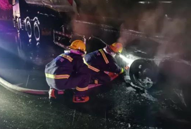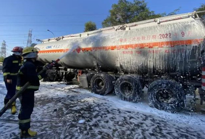 12月17日17時31分,東營市河口區孤島鎮315省道馬場西邊道路上一輛滿載32噸汽油罐車輪胎起火,油罐車南側100米處緊鄰加油、加氣站。一旦油罐泄露或爆炸造成大面積流淌火后果不堪設想。接到報警后,河慶路消防救援站立即出動前往處置。消防員行進途中聯系報警人得知,剎車制動溫度過高導...
