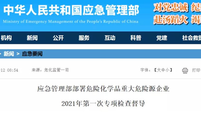 應急管理部部署危險化學品重大危險源企業2021年第一次專項檢查督導